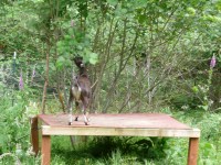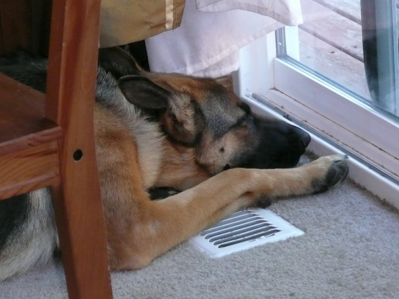 What a great weekend compared to the last one! It was about 76 degrees, with a cooling breeze, absolutely gorgeous. When I wasn’t outside, I was inside enjoying the 68 degree interior weather provided by our new AC unit. Since we dropped $10k on that thing last year when the other one broke, I refuse to feel the slightest bit hot, or even feel like I’m about to feel the slightest bit hot, whenever I’m inside. Ceri makes good use of the vents; whenever we come in after one of her ChuckIt games, she falls asleep on top of them with the cool air blowing in her face. For anyone not familiar with ChuckIt, it’s basically a stick with a scoop on it that throws the ball for you. Ceri is totally addicted to it, I think I play about 200 games of ChuckIt a day. We keep it on top of the bookcase, and when she wants to play she’ll stare up at it with forlorn puppy eyes. If you ignore her, she’ll start making these heavy sighs, and her eyes get even bigger and more forlorn. I can go about 5 minutes before I start feeling like the worst puppy-mama in the world, and I’ll go play with her.