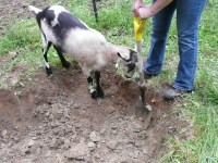 In animal news, everybody is pretty happy and content. The chickens and the turkeys got their favorite treat today, watermelon. Every time I go outside, they all run up to me and cackle. They are so much friendlier than I ever thought chickens could be! When I was harvesting today, every time I turned around I would have three or four following me. The goats are fat and happy; they just finished eating a kohlrabi that I picked from the hoop house. Having never grown them before, I don’t know how to tell when they’re ripe. I figured they might be ripe now, since they’re waist high. They sure do put down a root system – I almost needed a shovel to get it out of the ground. I still don’t know if it was ripe or not, but it looked like a thin squid when I hosed off the dirt. Granted I’ve never eaten one before, but it sure didn’t look like what I saw them using on Top Chef. The goats seemed to enjoy it though.