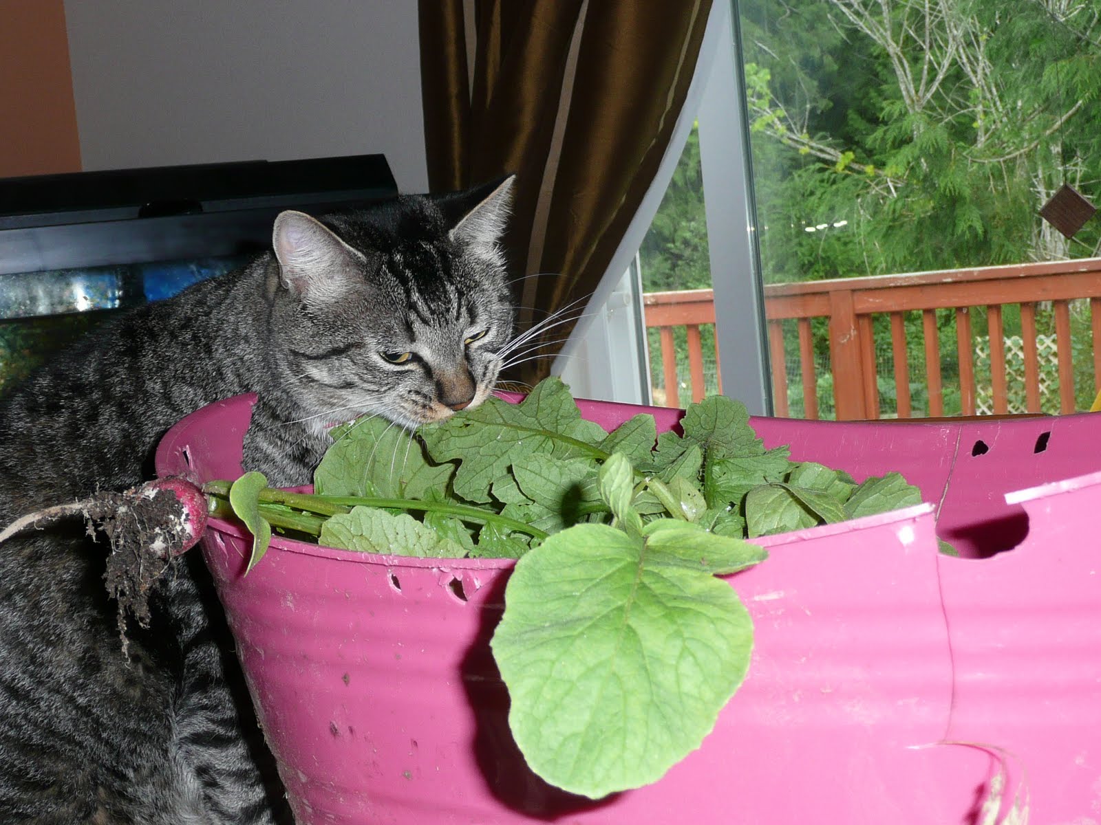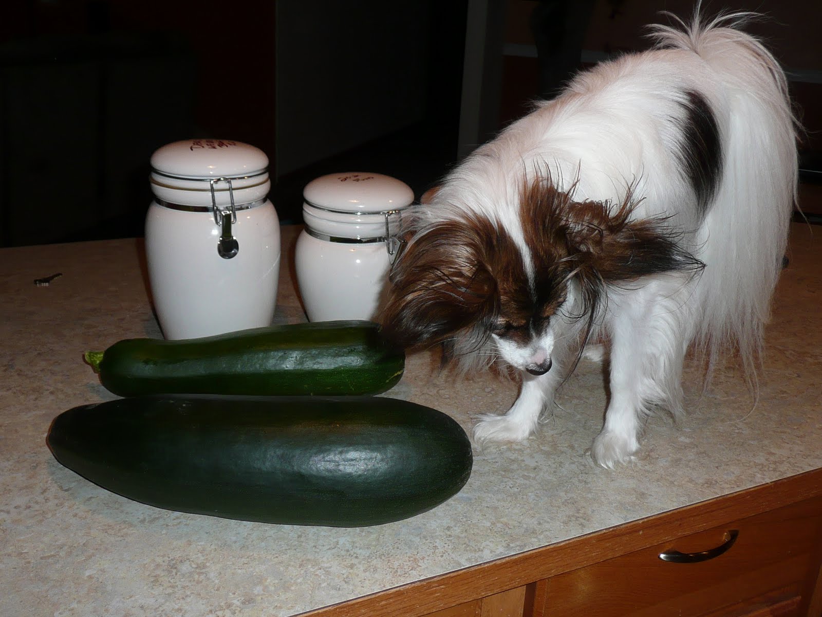 I’ve spent most of the weekend outside, and I’m excited to say I harvested my first batch of veggies! I got a big bunch of radishes, a huge load of cucumbers, two zucchinis, beans, and a few lentils. I filled my pink harvesting bucket, and when I brought it inside and set it on the kitchen table, Thing One, otherwise known as Fatty McChunk, helped himself to the radish greens. I’m going to make pickles with the cucumbers tomorrow, and I’m not sure what I’m going to do with the zucchini yet. One of them is huge, almost the size of Chupi. I’ve helpfully photographed the two of them together for reference. And don’t worry, it only looks like the puppy is on the counter. I would never allow that to happen, because that’s gross and disgusting and all the pets in the house respect my authority. They never get on the kitchen table, either. (For those of you who are now wondering if you’ll ever eat anything prepared in our house, please keep in mind that around here pet hair is considered garnish. You’ve been warned).