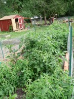 The other thing I’m not worried about is the tomatoes. They grew an amazing amount in the space of a week, and they now resemble a hedge. It’s one collective, singular plant now. I call it the Tomatanator. It wouldn’t surprise me in the least if it grows spikes and begins defending itself, it’s that big. As if I needed any more proof that I totally suck at spatial relations… guess I planted them too close together. They also grew over the carrots and beets that were growing in between them. Actually, “assimilated” is probably a better word (Star Trek reference, anyone?).