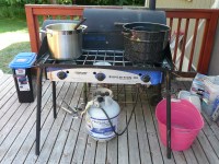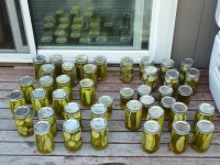 In actual farm news, I’m proud to say that we canned 42 jars of pickles in the last few weeks! Gene cheated a little, because we had to buy our cucumbers from a local farm, but it’s a farm I love to support. Big shout out for Duris Cucumber Farm in Puyallup, for everybody local. While we were prepping the veggies for pickling, every time I looked up one of the puppies was eating a cucumber. I would take it away, and within five minutes, they had another one. We were storing the ones we were slicing in a huge water filled cooler in the kitchen, and I knew they weren’t getting them out of there (I’m a detective, I get paid to be observant!) It took me an embarrassingly long time to figure out they were getting them from the box we had stored in the back room. We had a lot of fun, though, the pickles taste amazing. I also totally reorganized my canning supplies; we bought a new storage shelf and I’ve already filled it up. Although Bess Bess was impressed with our supply of canned and dehydrated supplies, the mere subject of our “Apocalypse Closet” fussed her greatly. She was similarly un-impressed with our experiment to dehydrate eggs. Since we’re getting 8 fresh eggs a day now (and one can only eat so many in day), we decided to try dehydrating them for storage. It actually worked pretty well, at least the dehydrating portion of it. We haven’t tried reconstituting them yet, but judging from their appearance, I expect the taste and consistency will remind Gene of his Army days, and probably not in a good way.