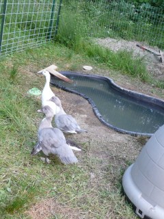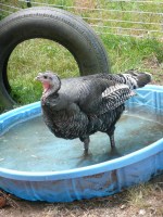 Since it’s been so hot here during the day (and cold at night, whatever, Washington weather gods, you suck) most of the animals have been hanging out poolside. The wading pool is supposed to be for drinking only, but no one pays attention to the rules (particularly the exit the pool to go to the bathroom rule — good thing they don’t have a hot tub!). I have to refill it once or twice a day. Who knew turkeys like to wade?