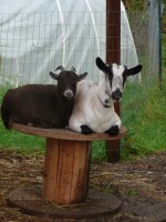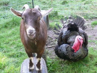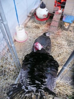 Feeding time here at the zoo has become a well-orchestrated task. Since everybody prefers everyone else’s particular type of food, when I open the gate armed with my pink food scoops hilarity ensues. Followed quickly by howling, pecking, and head-butting. I feed the goats first; they get a large scoop of goat chow sprinkled with poultry pellets. The pellets, which the goats love, distract them long enough for me to open the door to the turkey kennel and fill their bowl. Now that the fancy chickens are living in the A-frame, I have to quickly put the metal grate over their door to keep the turkeys out. Sometimes Fiona will abandon her bowl to the ducks and come charging over to try and steal the turkey food, so I have to slam the kennel door, then usher the turkeys in one at a time. Tonight I slammed the door, and Fiona went back to battling the ducks for a spot at the trough. I went back to securing the fancy chickens, and when I turned around Thanksgiving was standing in front of the door, staring at his food dish disconsolately. He looked like a fat kid that got to the candy store five minutes after they closed. I opened the door for him, and of course he waddled to the wrong side, getting himself stuck between the open door and the kennel fence. Because A) he’s not the sharpest tool in the shed and B) he’s so fat moving any way but forward is difficult for him, he was stuck having to make what turned into a 39-point turn. Keep in mind that by now it’s dark, it’s raining, and I have a new cast which makes my right arm totally unusable, so by now mama’s a little on the cranky side. I tried to help Thanksgiving by turning him to face the right direction, and he rewarded me by taking a huge chomp out of my leg. Lucky for him I’m still on pain meds, or a particular holiday might have been celebrated tonight.