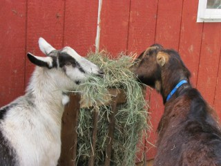 Feeding time has proven particularly interesting with four goats – normally Fiona and Buttercup don’t eat a ton of the orchard grass I put in their feeder, but once they realized Sam and Jack loved it, all four embarked in a straight up eating contest. Fiona had so much orchard grass crammed in her mouth she couldn’t even chew it, and Jack buried his head in the feeder so no one else could get any. Fiona finally got sick of Jack both figuratively and literally hogging the feeder, so she head-butted him halfway across the pen. I can’t tell you how many times I’ve been tempted to do that while in line at a buffet so seeing it actually happen was rather gratifying.