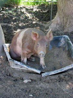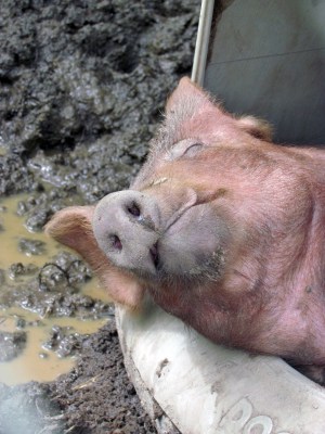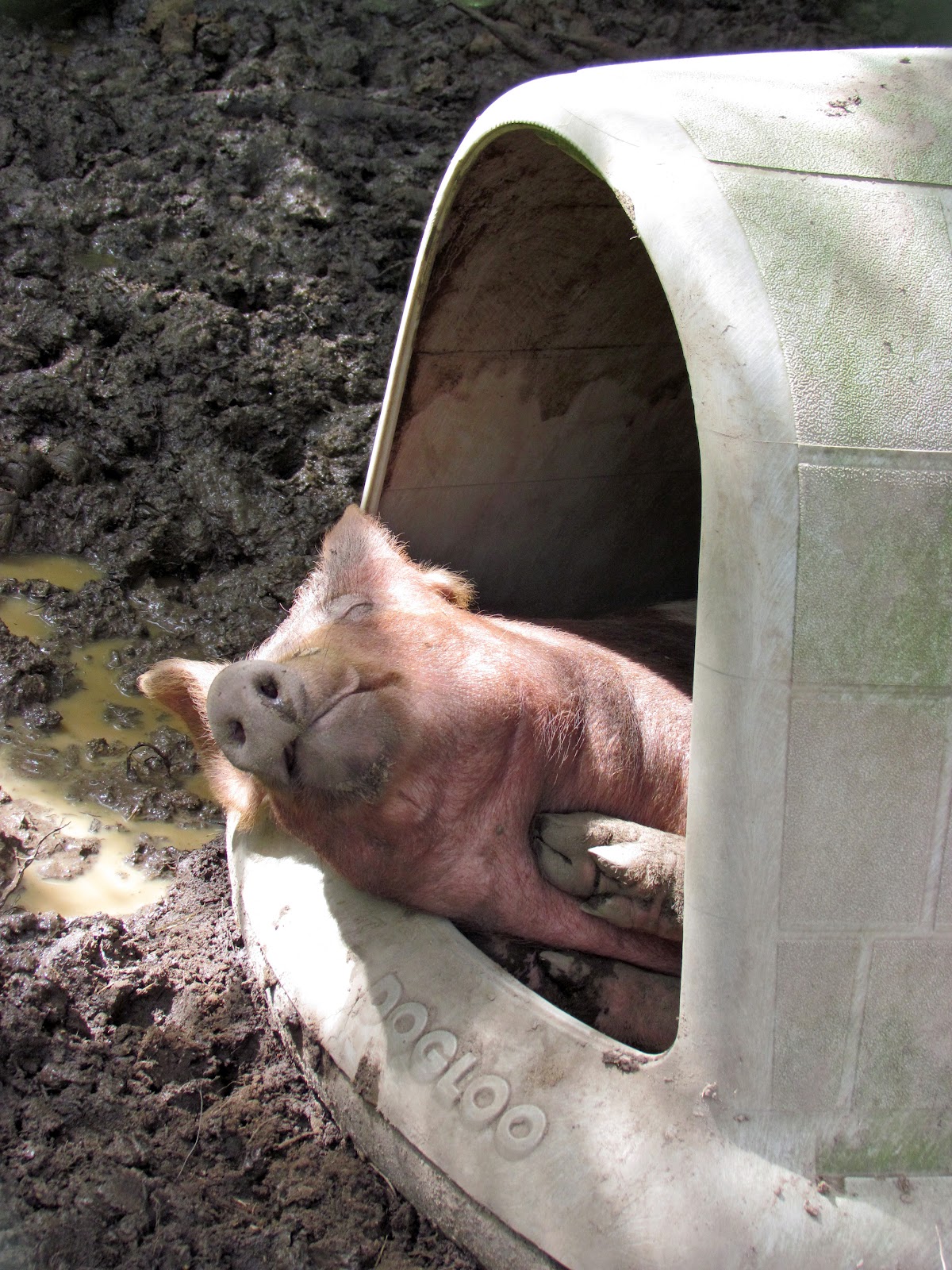 During the last few days, we had several torrential rainstorms, and the excess water turned the Swine Estate into a huge mud bog. The pigs are ecstatic, but wading through the mud to feed them is rather terrifying. You know that nightmare everyone has where you’re trying to run from a snarling monster but you can’t get your feet to move fast enough? That’s what wading through the foot-deep mud is like, except there’s three monsters and you’re not sleeping. The worst part is getting stuck in the mud, and having to throw the feed in the general direction of the tub to distract them long enough to extract your boots. As scared as I am of the pigs, going out first thing in the morning and seeing them sleeping in a huge snoring pile makes up for the terrifying drama of feeding them. Almost.