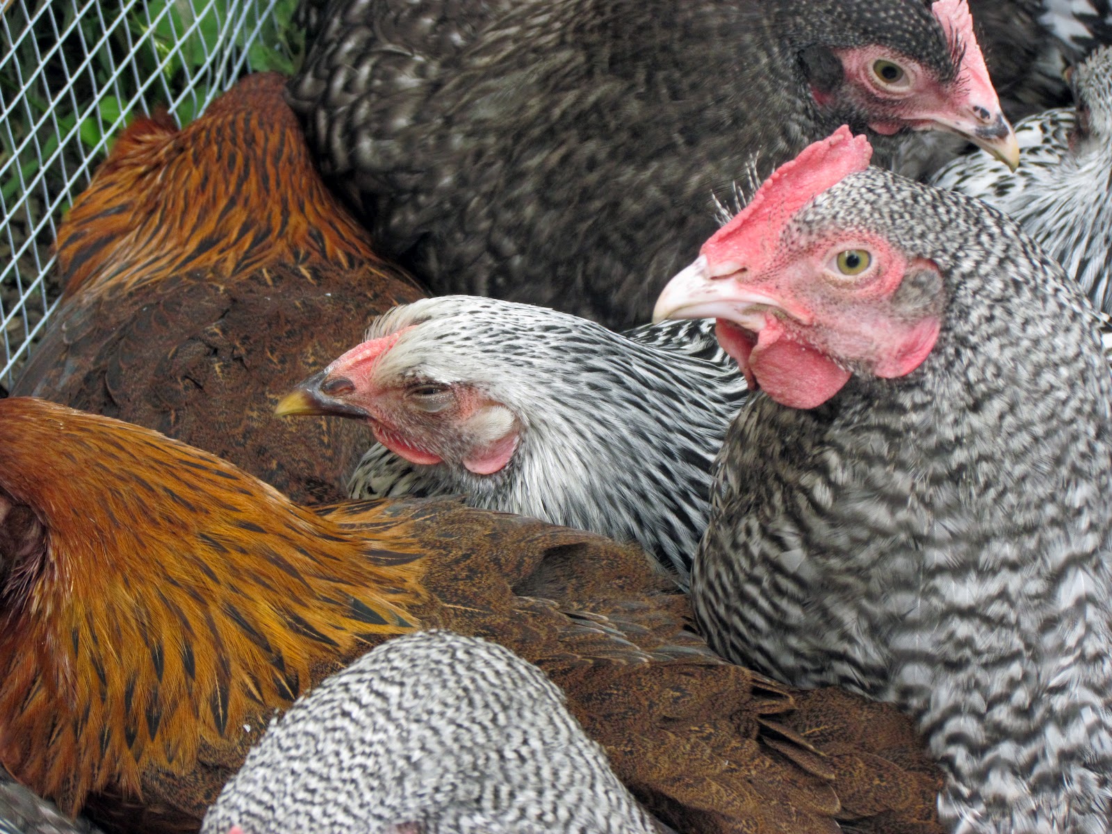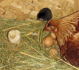 The big pile of eggs our brooding hen has been nesting on for the last few weeks finally started to hatch! She was originally nesting underneath the shed, but I pulled her out and made her a secure nesting area in the old chicken coop due to May’s coyote invasion. Of the 11 eggs, three have hatched; we have one black chick and two all-white ones. I’m not sure when the other eggs will hatch, since I don’t know when she started nesting in her hiding spot. Broody chickens have the habit of wandering around looking for eggs, any eggs, then rolling them back to the nest, so I have no way to know if they were all laid on the same day.