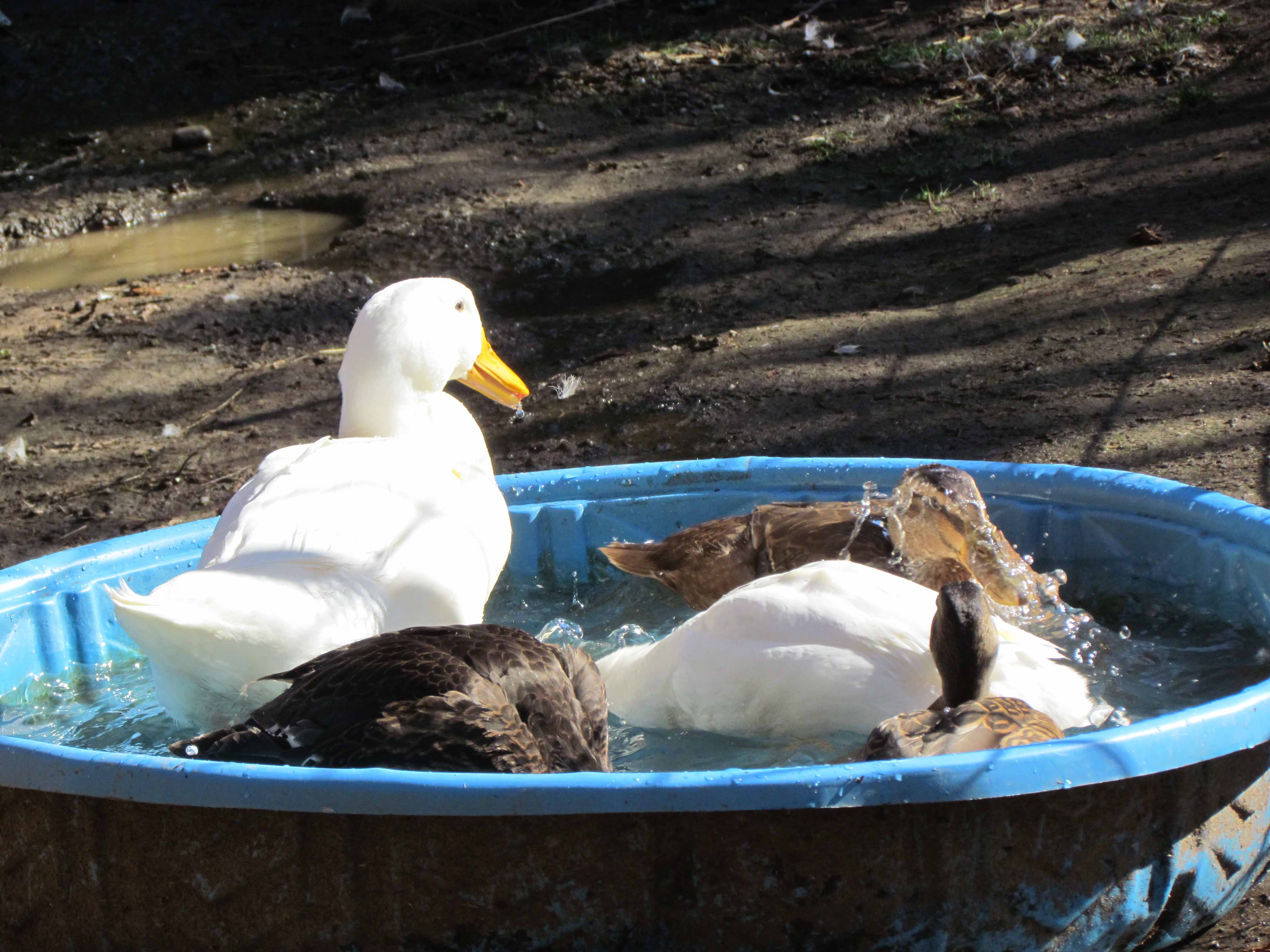 the bulk of their time hosting pool parties. In fact, they rarely ever venture more than five feet from the big pond, and that’s to take a sun nap. Ducks grow up much more quickly than chickens and turkeys; the cute fuzzy duckling stage lasted approximately five minutes. They only spent a month or so in the brooding box, and as soon as they were fully feathered out I relocated them to the duck mansion. It wasn’t because they complained like the turkeys, they were actually quite calm and happy inside the box. They just spent their entire time in the litter box wading pool, excitedly splashing about, which forced me to clean the box two or three times a day. I don’t mind the extra work, but white shavings don’t grow on trees and they were blowing through two packages a week.