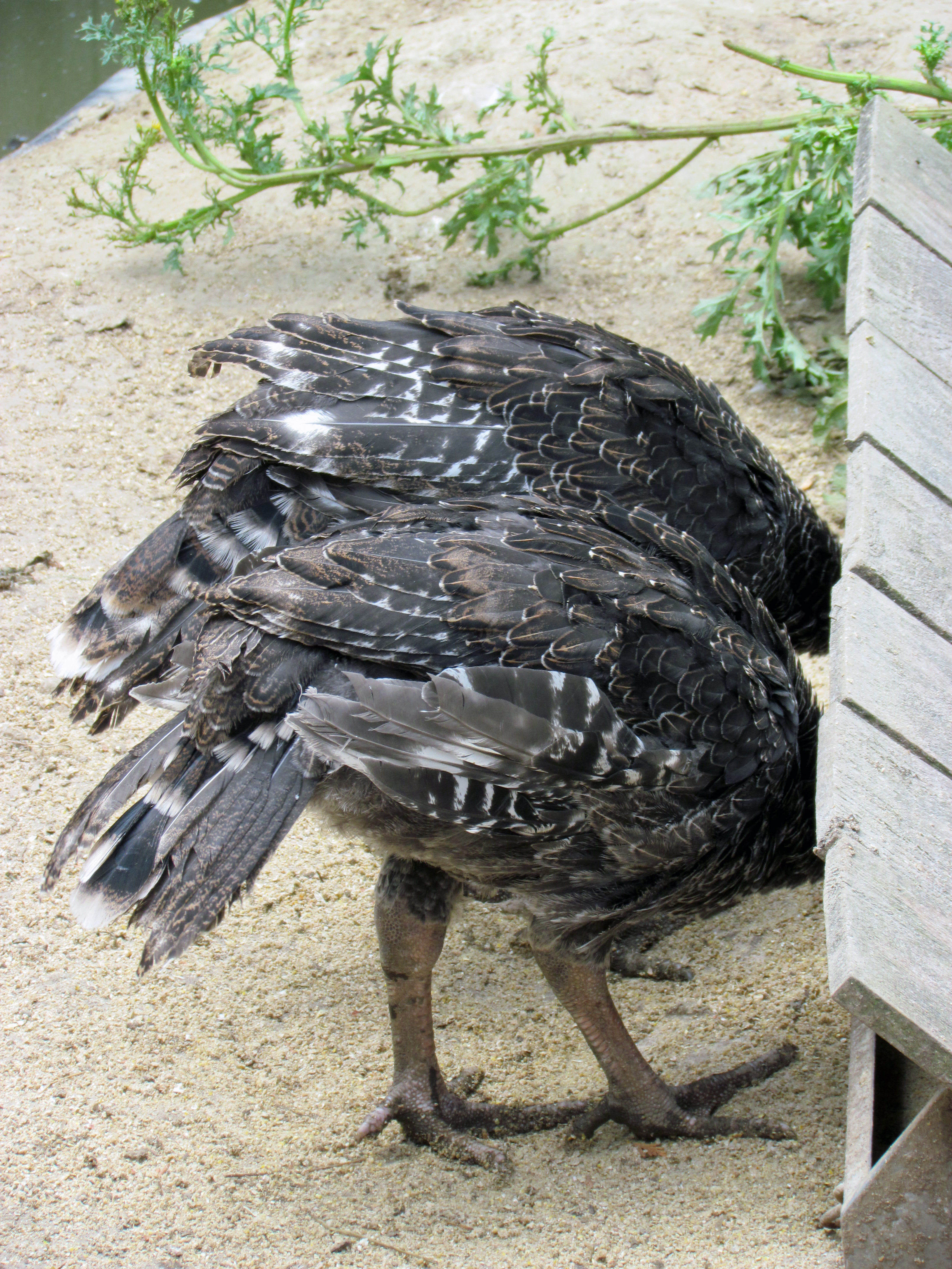 would huff and puff, then jump on their climbing logs and launch themselves at the wire mesh cover. I took that to mean they wanted to be outside, although after I set them loose for the first time I had a brief worry that the wire mesh cover was the only thing preventing them from attacking my head. Luckily for me, they were far more interested in exploring their new environment, and now they follow me around chirping happily whenever I go out there. Although fully feathered, they are in that awkward teenage phase where they disturbingly resemble Skeksis from the Dark Crystal, minus the ceremonial robes.