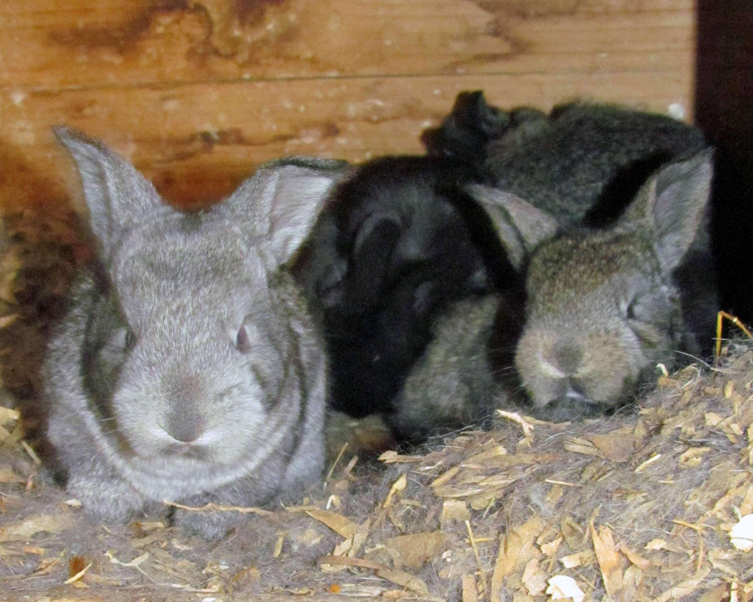 The one thing I’m not doing this winter is bottle feeding baby bunnies, thank god. Cinnabun is an excellent mama, and her kits are finally big enough that she allows me to pet them, and more importantly, take their picture! I was cleaning out around their nesting box a few days ago, after distracting mama with a giant pile of Wheat Thins, and I glanced inside to find five baby bunnies. I was relieved – five is a number we can manage. I was sure there’s five people within a 20-mile radius of us that haven’t bought a baby bunny yet. So I slid the box over to clean behind it, and six more bunnies tumbled out from behind it. So yeah. Eleven is a good number too. Who wants a bunny for Christmas????