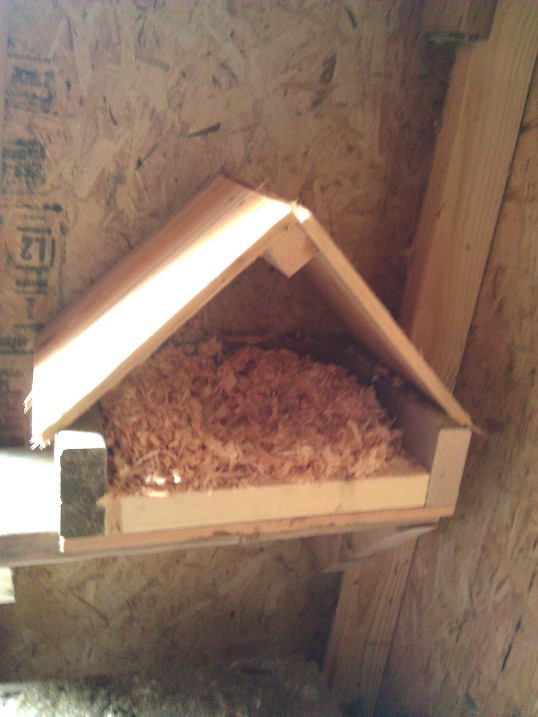 Gene and I spent the afternoon crafting the perfect nesting box, in hopes of enticing more chickens to lay where I can actually find the eggs. Now that it’s getting colder and the days are way too short, I can’t afford to have hidden forest eggs cutting into my stock. We decided on cedar A-frame nesting chalets, which are all the rage with the chic city chickens, at least according to Poultry World magazine. After building them with my supervision, and to my exacting standards, Gene hung two of them in the coop. I can’t wait to see if there’s eggs in them tomorrow! I’m hoping the guineas will use them as well; they should start laying any time now and I’m curious to see what their eggs will be like.