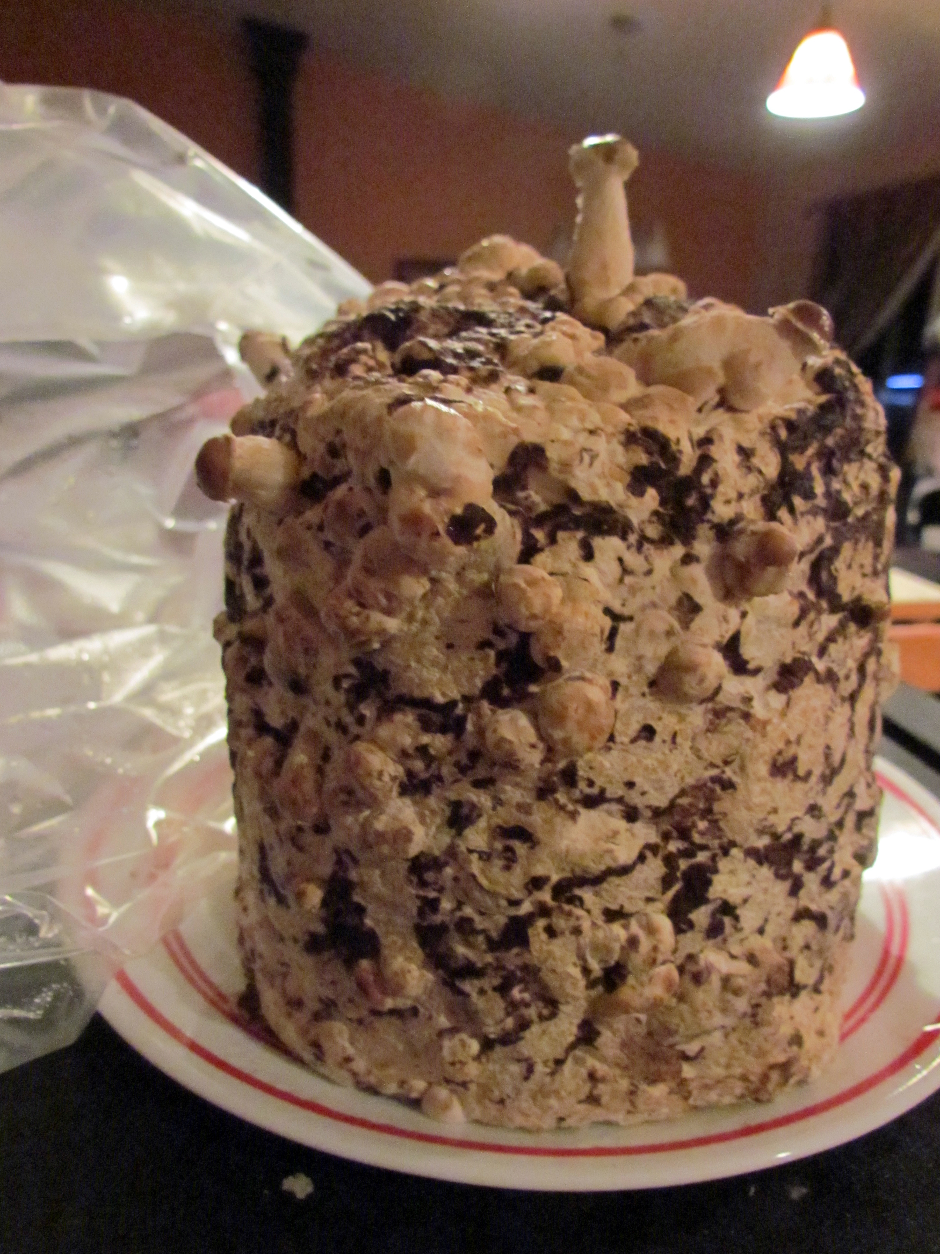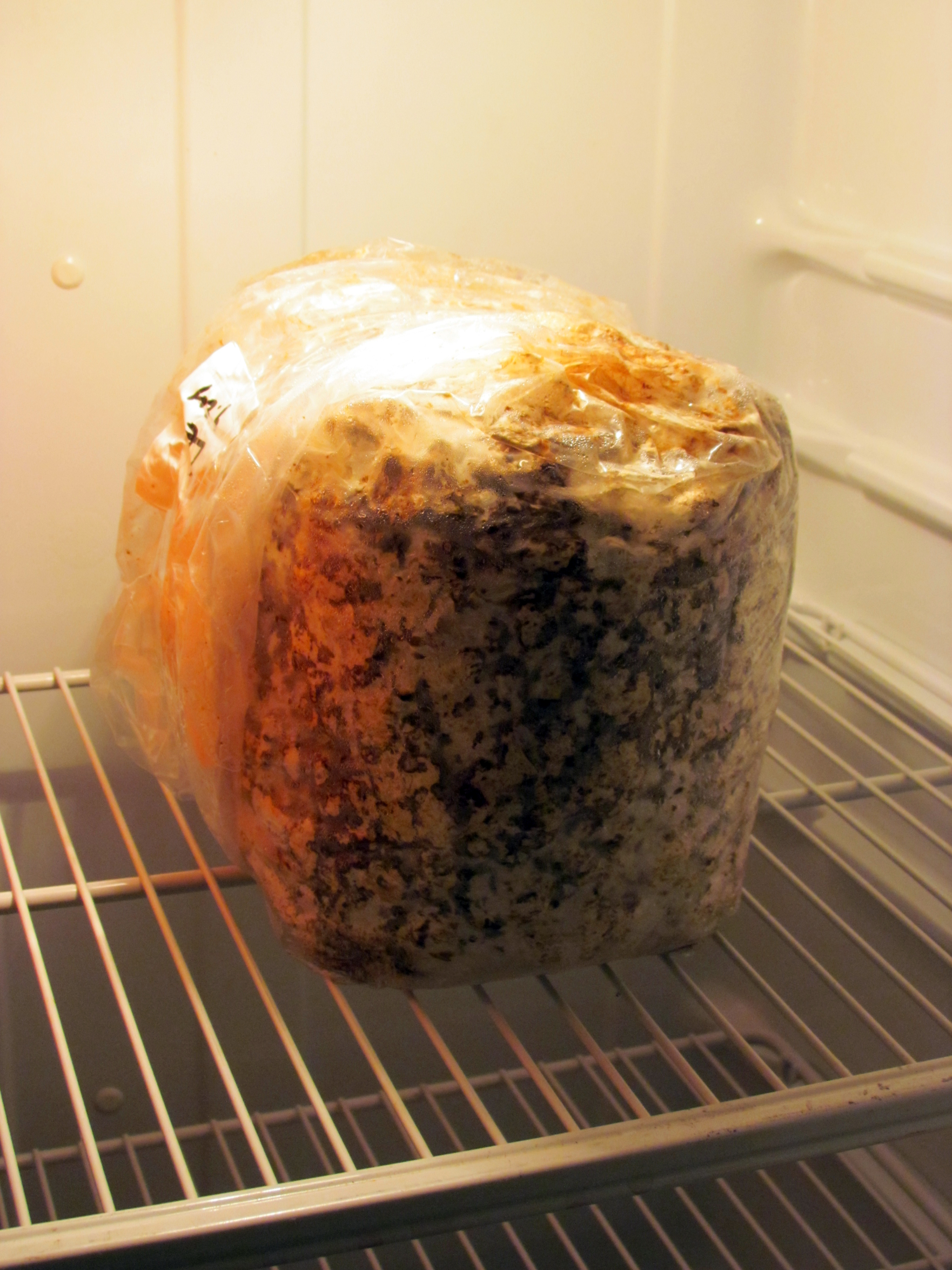 I’ll be the first to admit I need a lot of distractions from the weather to remain happy during the rainy months. Don’t get me wrong, the farm keeps me busy during the day, but once the sun sets and all the critters have gone to bed (before 5 pm!!!), I’m faced with a lot of free time. Thanks to the good folks at Fungi Perfecti in Olympia, I found a way to fill the void – with mushrooms! I ordered a shitake mushroom kit so that I could grow my own at home, instead of paying $14.99 a pound at the store. The mushroom kit arrived today, along with a small novel containing all the care instructions. Judging by our backyard, I was under the impression that fungi grew profusely on its own with no human intervention whatsoever, but leave it to me to find the one species of fungus that demands to be spoiled with attention. Like three times a day. Apparently shitake mushrooms adhere to a schedule – four days in the refrigerator, then three to four mistings a day for a few weeks. And then, if it suits them, you’ll be rewarded with tasty mushrooms.