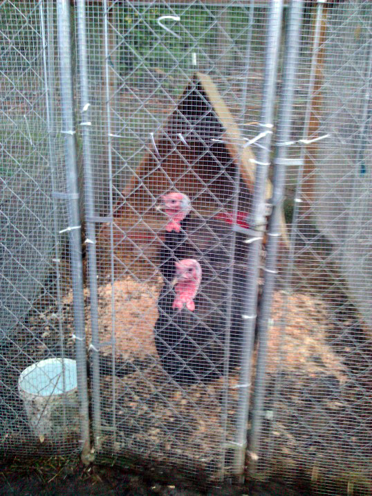 Of course, I have to lure them there with scoops of grain, but still. They respect my authority. I usually let Dimsworth and Hawthorne stay outside, though, since they mostly hang out on the deck anyway. Except for today. I came home from running errands and went outside to check on the zoo, which of course means I had to throw scratch to the frenzied horde of chickens gathered around my feet. If they don’t get their scratch, they will literally follow me around, wherever I go, in a great teeming horde that makes it nearly impossible to walk. Dimsworth and Hawthorne usually waddle over to get their share, knocking chickens out of the way since they’re not big on sharing. Today was the first time I didn’t see them fighting for the choicest bits. After looking around, I realized I didn’t see them at all, which just about stopped my heart. I’ve really gotten attached to those crazy turkeys, although just this morning Dimsworth stepped on my bare foot and ripped a piece of toast out of my hand. (We have a habit of throwing old toast out the sliding door, sending it sailing over the deck and down to the