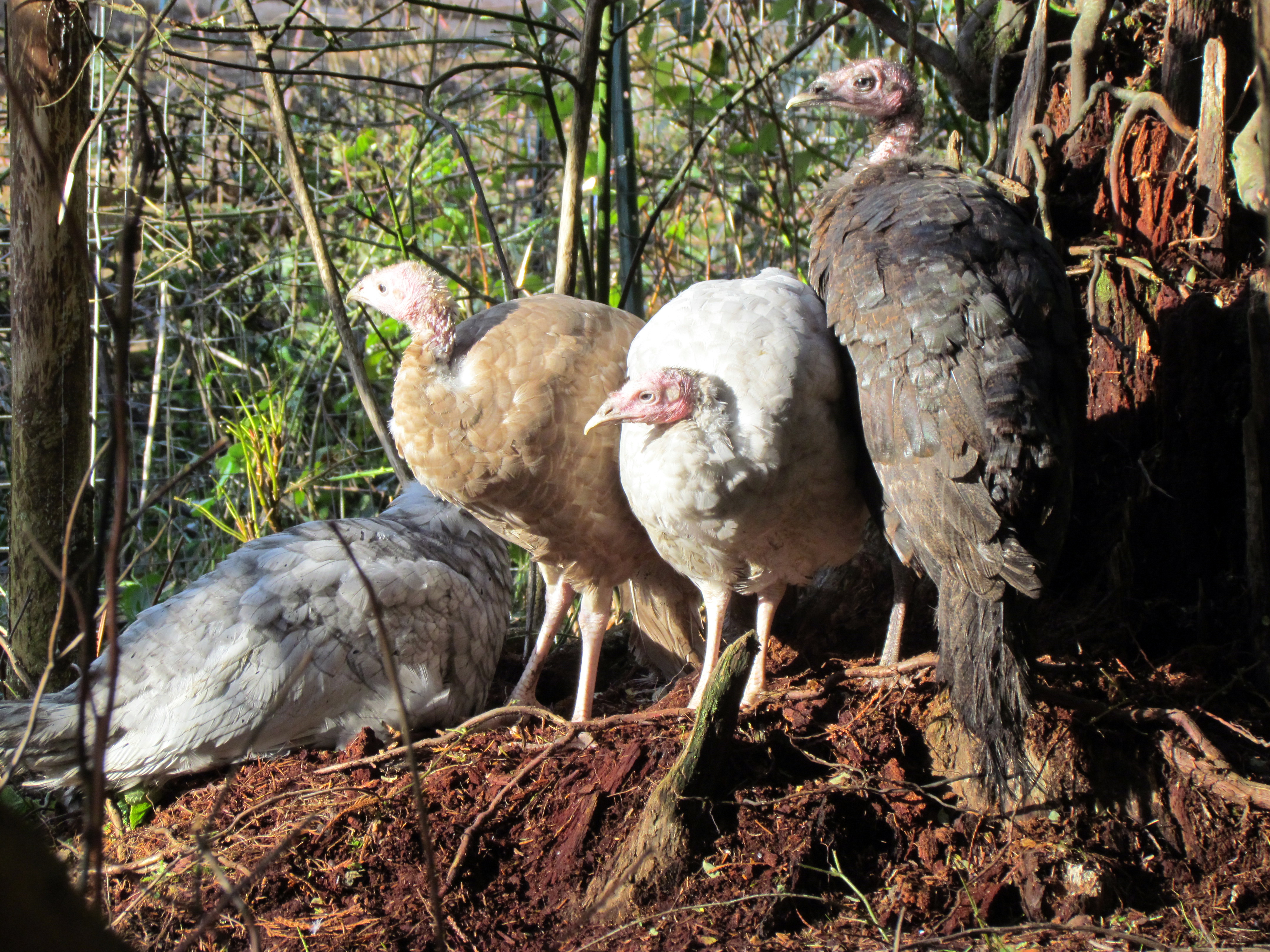 roosted up already, happily basking in the glow of the heat lamp. The turkeys, at least, don’t seem to even notice the temperature. Dimsworth and Hawthorne spend their days as usual, lumbering around the backyard, showing off for Hester, Constance, Prudence, and Temperance. The new lady turkeys seem to love it here, and have settled down into a nice routine. They have their favorite grazing, napping, and preening spots chosen, and divvy up their time accordingly. The only difficulty I’ve had with them involves their penchant for flying. Even when Christmas was their age, she never flew anywhere. These gals, however, seem to delight in flapping up to the roof, any roof, when it’s time for me to shepherd them into their chalet for the night. I’m positive they do it just to vex me, because if I turn my back on them, they jump back down and pace in front of the chalet door, hungry for their dinner. I had to find a ten foot long stick to use to herd them back down to the ground.