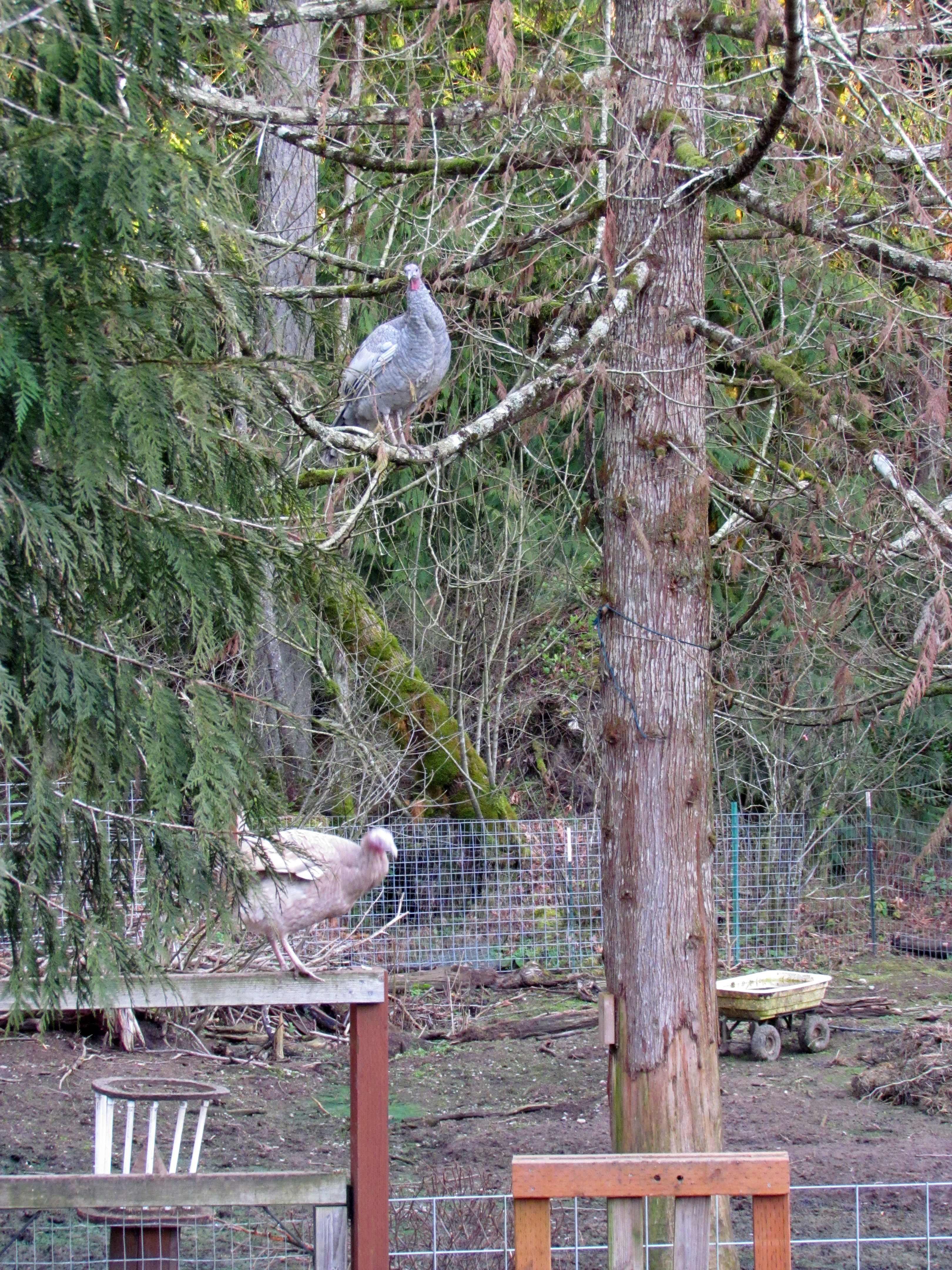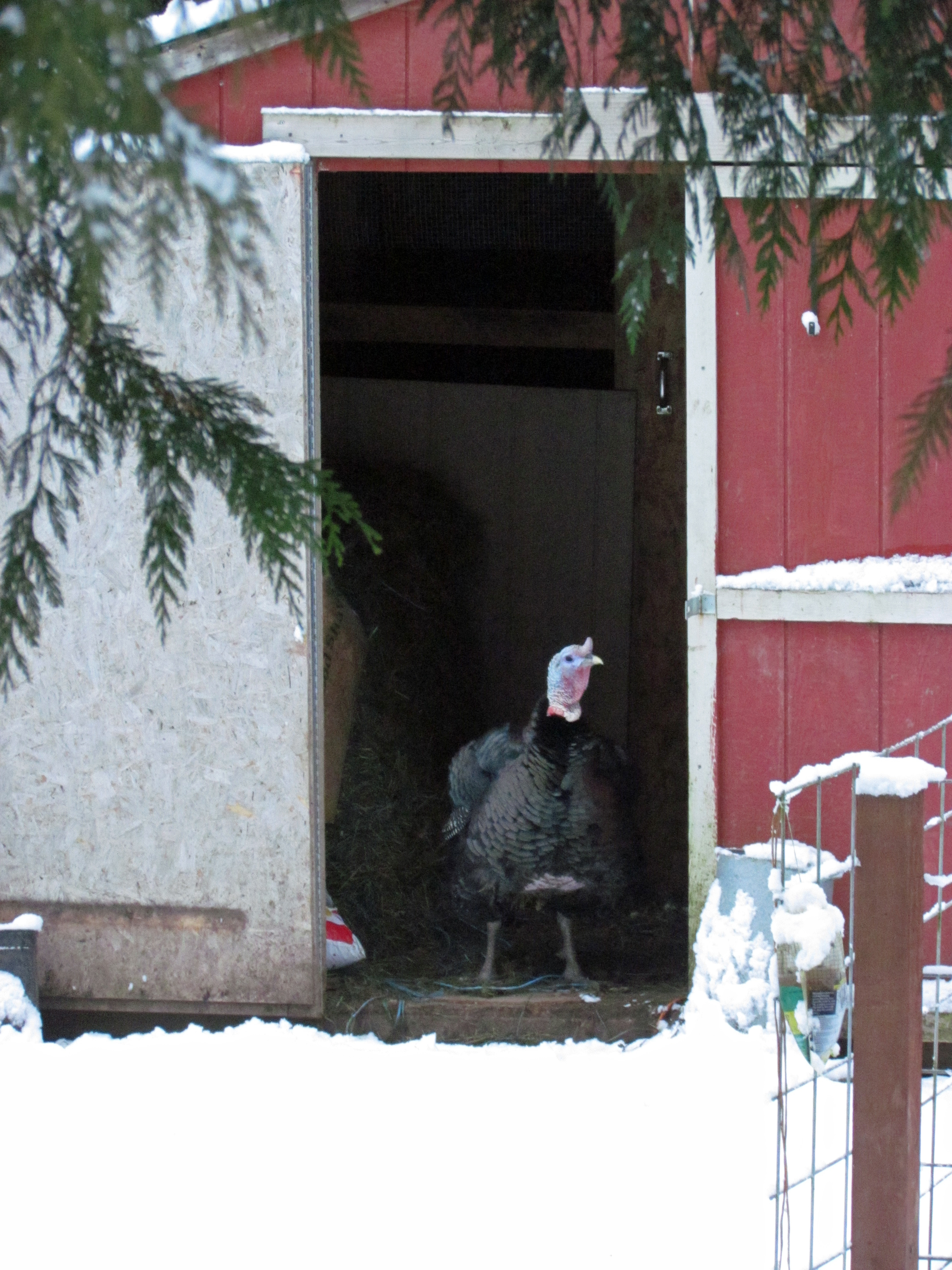 nuts, and that he’s fine outside, but when I went to put up the ducks one night, I shone the flashlight on him and he was shivering in the rain. That first night, I tried picking him up. Fatty’s up to about fifty pounds, I swear. And you know what smells worse than a wet turkey? Nothing. (Except perhaps the fertilizer we put on the living room avocado tree, because it was dropping leaves at an alarming rate. But to be fair, it’s pretty much the same exact smell, and I don’t sit on that couch anymore, cuz damn, that be a stench.) At any rate, that particular night I was glad to be wearing Gene’s jacket. Now I just gently push at Dimsworth until he jumps off the stanchion and waddles into the shed of his own accord.