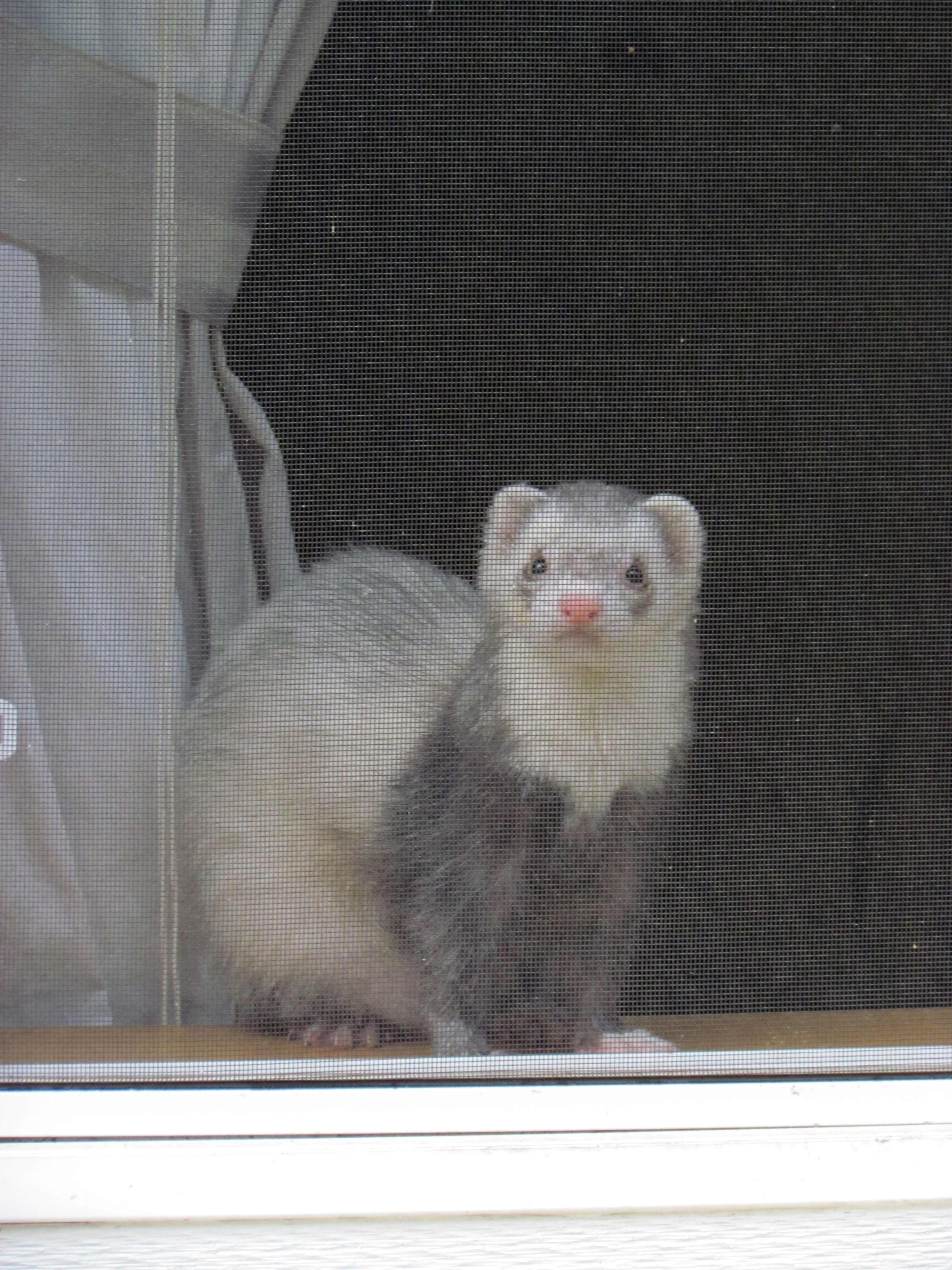Raphael, on the other hand, is not such a respectful sibling. I let him out the other day into the guest bedroom (usually referred to as Raphael’s playroom), which I do several times a day. This time, though, I decided to open the window since it was nice out. After about thirty minutes, I heard a general kerfluffle from the deck, and stepped out to see agitated chickens shaking off the remains of their deck-side dusts baths. (I can’t keep potted plants on the deck anymore, since all the pots of dirt been taken over for bathing purposes). I had to laugh as I saw Raphael gleefully clinging to the screen, then hopping down and springing forward again and again.