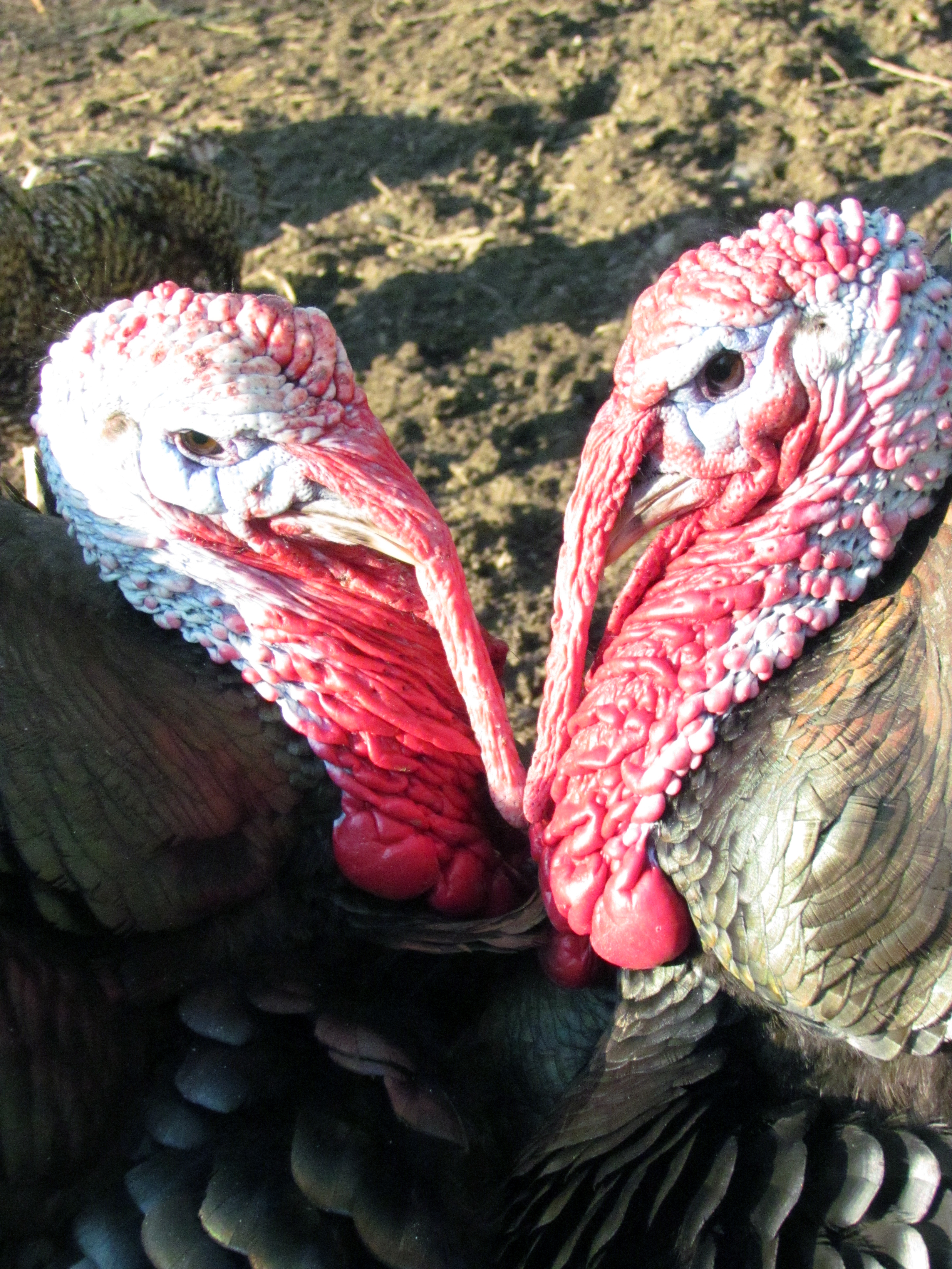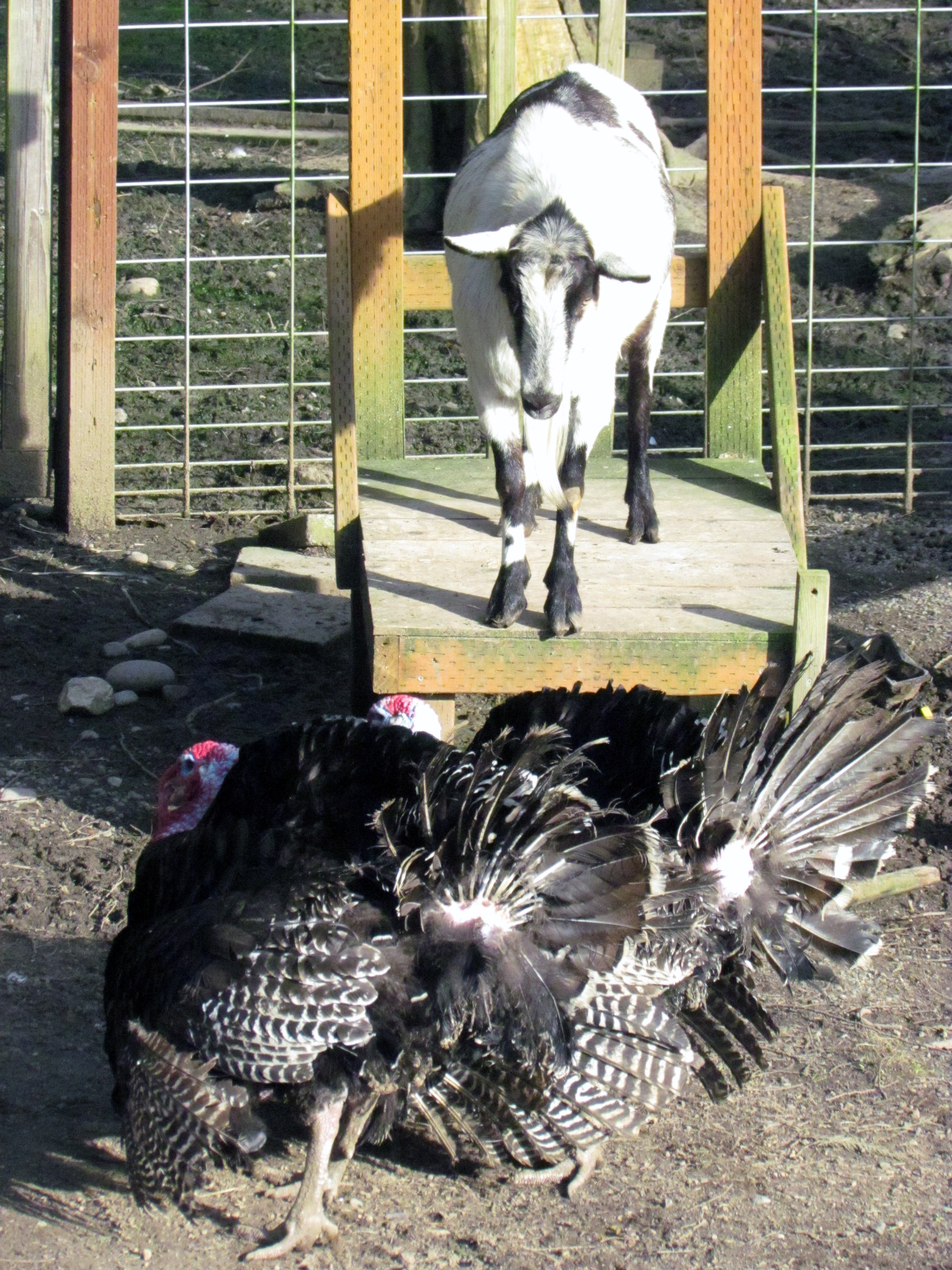 Gene and I came home from running errands in town to find a full on prison break going on in the back yard. Even Fat Ursula was out, so you know the eating had to be good. As soon as the goats saw me watching through the fence, they immediately stampeded back toward the pasture gate, which of course was closed since they’d trampled the fence to get out. Unfortunately for Fiona, she made the mistake of getting between Dimsworth and Temperance, who were trying to share a moment. The two male turkeys immediately turned to defending their women, and treed Fiona up on the milking stanchion. Once I got the goats secured, I noticed that Temperance, who up until that moment had been Dimsworth’s loyal girlfriend, was now enamored with Hawthorne. Apparently he did a better job of defending her from the fearsome goat herd, and now poor Dimsworth is yesterday’s news. For his part, Hawthorne didn’t make the transition gracefully, he totally shoved it in Dimsworth’s face with his incessant gloating, igniting a territory war that is going on even as I type this. I had to separate the two of them, one in the pasture, on outside, and they’re currently hurling insults at each other through the fence. Even though it’s pitch dark and they can’t possibly see each other. I feel sorry for Prudence, Constance, and Hester, who apparently just don’t measure up.