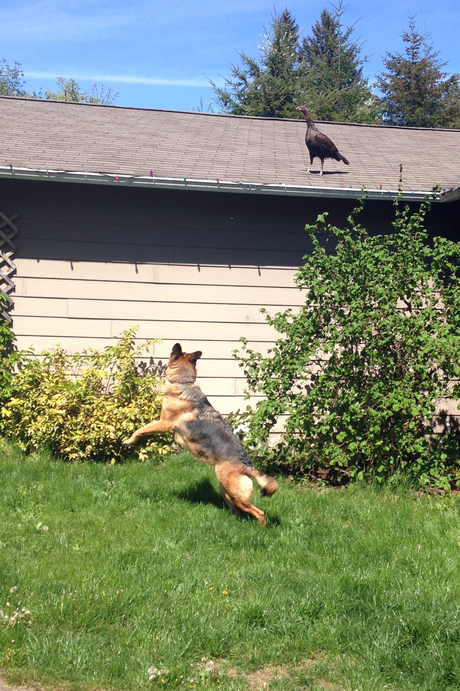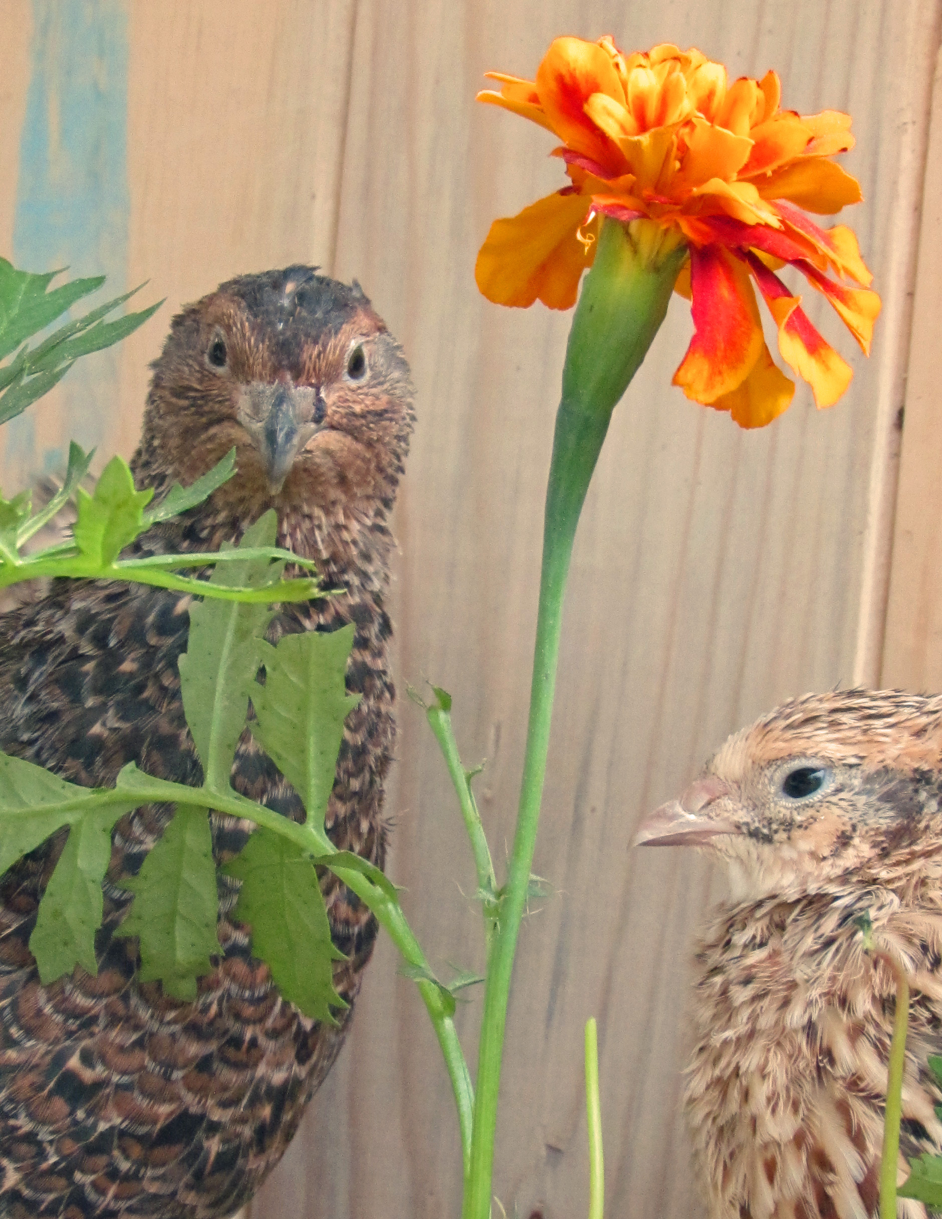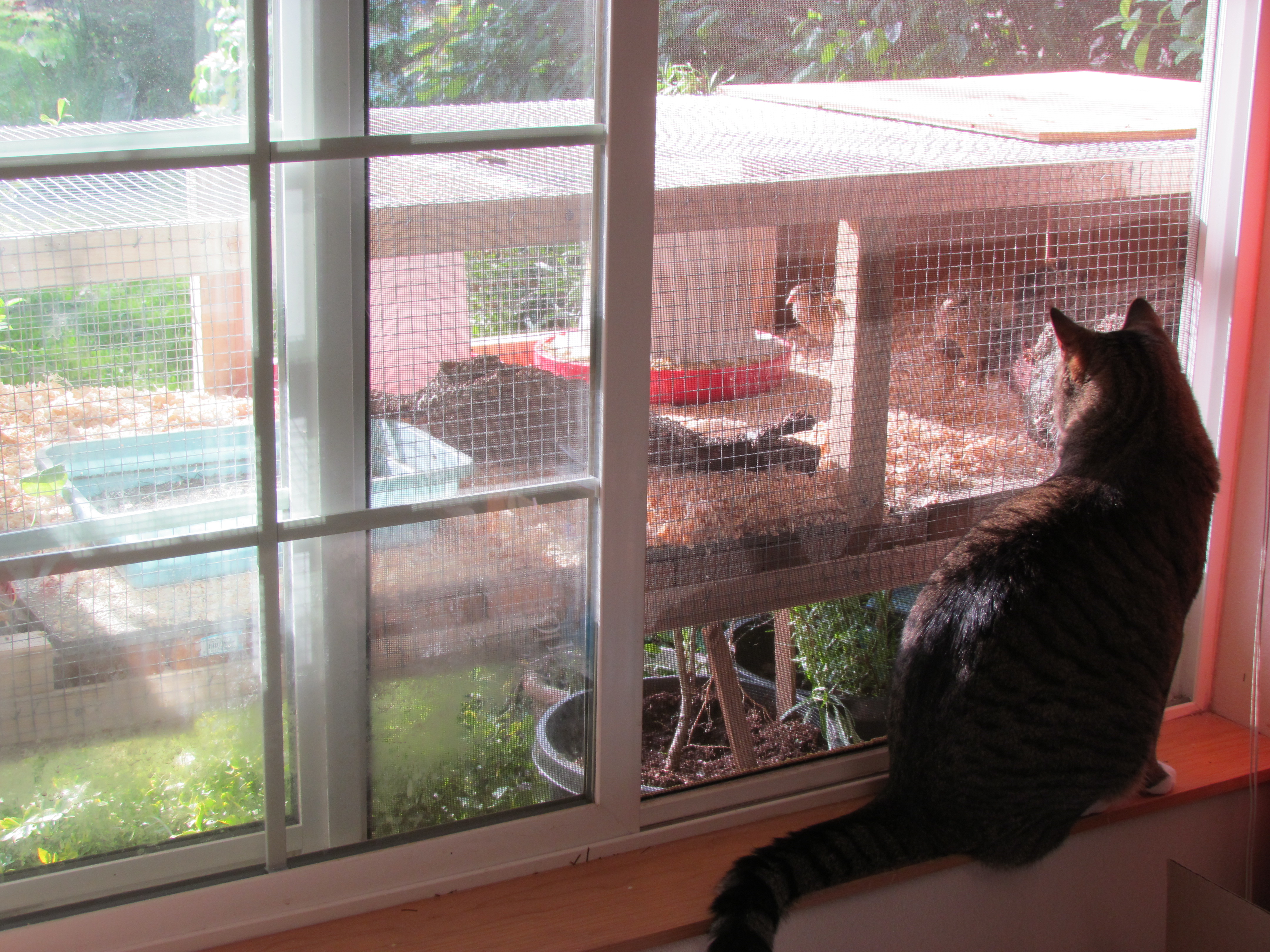 distract her with a treat and stick his head in the nesting box. He was able to count four babies before he heard the growling and the thundering of angry bunny paws coming right for him. Knowing the way bunny math works, she probably has about 54 of them in there. I’ve been letting Harvey come out during the day; he’s content to hop around by the deck, scattering chickens and turkeys and ducks in every direction. He only stays out about fifteen minutes, then comes back to check on mama. It’s pretty cute, actually.