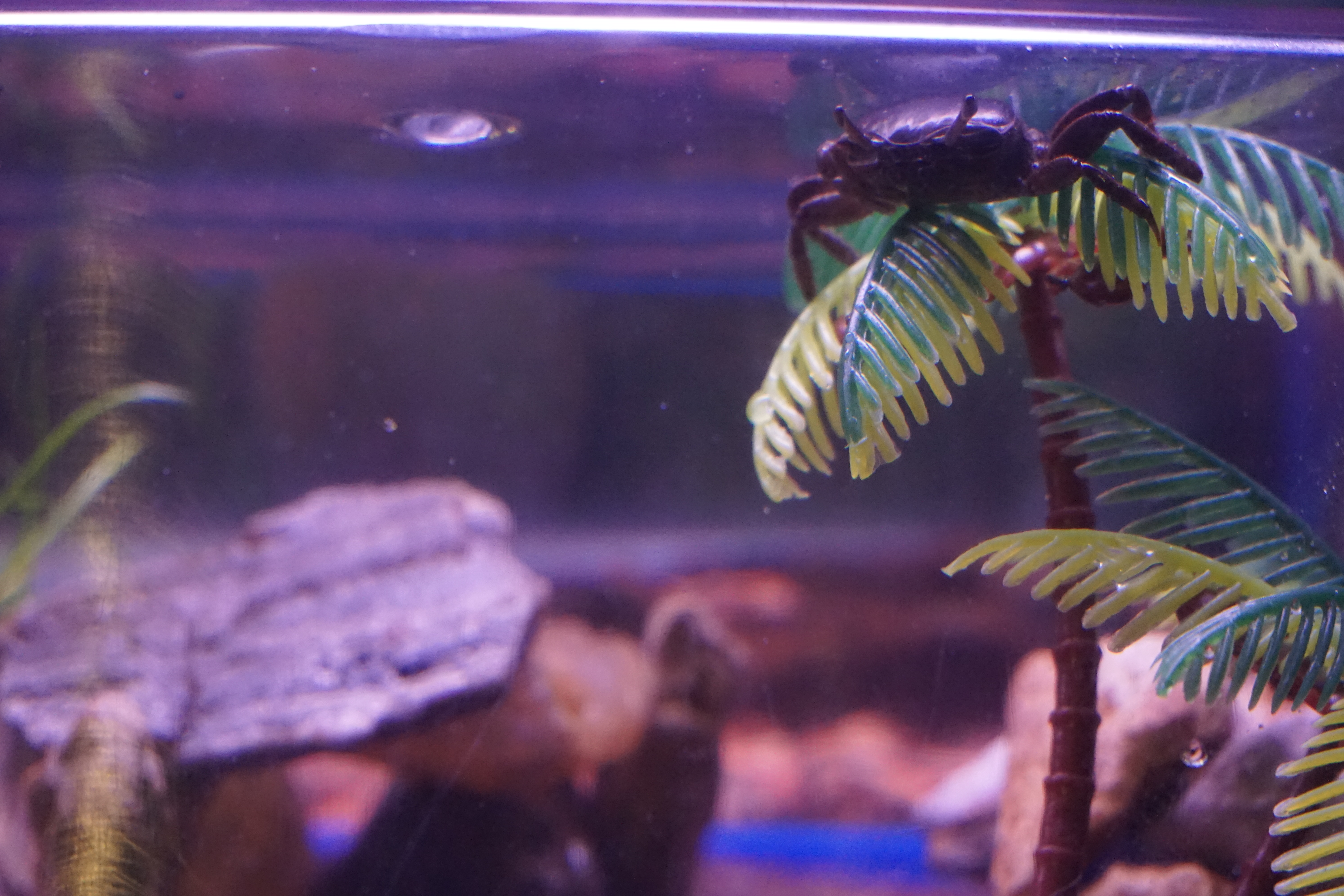 some actual crabs to live in it. Apparently there is a world-wide Thai Devil Crab shortage (for real, several aquatics people told me no one can get them right now), so I had to settle for Fiddler crabs. Smaller and less colorful, but still plenty fun to watch. So Gene took me to the pet store, and after observing the crabs for far too long (according to Gene), I committed to two of them. Charlie and Luigi II came home in a take-out container, although Luigi II did try to initially make a break for freedom when he hopped out and took off down the aisle. Getting them into the Crabitat itself was a little disconcerting, because I had to hold them in a very loose fist, then gently shove them under the lip of the plastic dome. The way their legs skittered in my palm was a little shudder-inducing, but at least I only had to do it twice. Watching them explore the river and climb on the palm trees was great, they truly looked like happy little crabs.