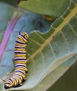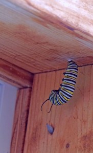 The other day I could only find three caterpillars on the milkweed, and when I pointed it out to Gene, he’s all “one of them is hanging right there” then pointed to the rafters. He said it had been there since that morning, and I demanded to know why he didn’t come running to tell me immediately because that qualifies as News.