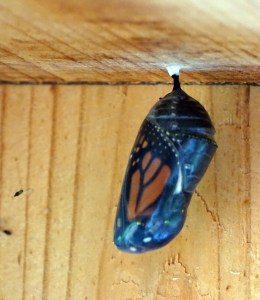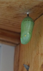 Even better, I have one more chance to watch the process from start to finish, as one of Monstro’s habitat mates has made a chrysalis right in the middle of the porch ceiling! Now I can photograph it from all angles.
