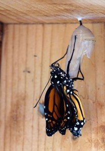 But in far less depressing news, the monarch emerged today! I’ve been watching the chrysalis like a hawk, because my friend Jennifer told me they turn black, then translucent, right before it happens. Sure enough, last night the cocoon looked really dark, and then this morning I could see the monarch’s wings inside! I reached in the front door to grab my phone off the kitchen table so I could text a pic to Bess Bess, and guess what happened during the 30 seconds that took me? Ya, I missed the Big Reveal by *this much*.