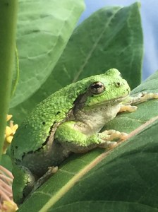 In other news, another monarch hatched out! Plus we’ve got two more chrysalises on the porch, which should open in another few days. Gene and I were over at our friend’s house yesterday where the milkweed came from, and I was searching under the leaves to see if there was a second wave of eggs yet. I stumbled across the biggest tree frog I’d ever seen, a fat fellow just a bit smaller than the palm of my hand. Gene said he got that big from eating all the monarchs as they hatched, which I guess is a good survival strategy even if it does make me shudder.