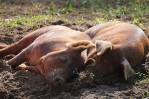 The pigs, on the other hand, don’t seem to mind their pasture one bit. They’ve got their pool, a nice clean barn to stay in at night, and all their favorite napping spots. Quite frequently I’ll go out to feed them, and as I get close to the barn I can hear them snoring in the sunshine, in a happy hog pile.