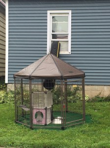 I’m glad he’s done with this DIY project, because I’ve already got another one lined up. We were doing the monthly shopping in Virginia the other day, and decided to explore some of the back roads a little. I saw the most magical thing – a fully enclosed cat pagoda in someone’s front yard that was accessed via a plastic pipe leading from the enclosure up to a window! Sure it looked kind of tacky how they’d taped off the window to hold up the pipe, and 8 feet of black plastic tubing hanging out of the house would probably make the collective heads of any HOA board members explode (good thing there’s none of those in a 300-mile radius!) but I know when Gene builds it for me, it will be super chic and incredible looking.