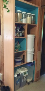 At any rate, we had a lot of things stored on the counters. A lot. I’m no Martha Stewart by any means, but cluttered counters have always vexed me mightily. The last straw was the 5-gallon water filter contraption that Gene stored on the counter when our water filter pitchers kept dying. It’s two huge white buckets that are like 3 feet tall combined. And that puppy took up a lot of valuable real estate. It’s not that I don’t appreciate delicious water, but having to move it from side to side depending on which upper cabinet I wanted to access got real old, real quick.