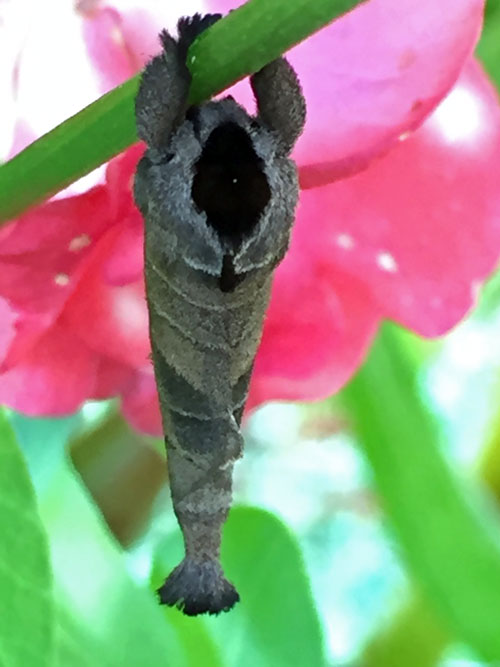 And then there’s this one, that I’m still trying to identify – despite nerding out and getting three different identification guides, including one that’s laminated and folds out like a map. It’s aptly named “Moths In Your Pocket” and I won’t say that I take it everywhere, even though it’s totally true. But I digress. Check this out – he sleeps by curling up into a roll and clinging to a stem: